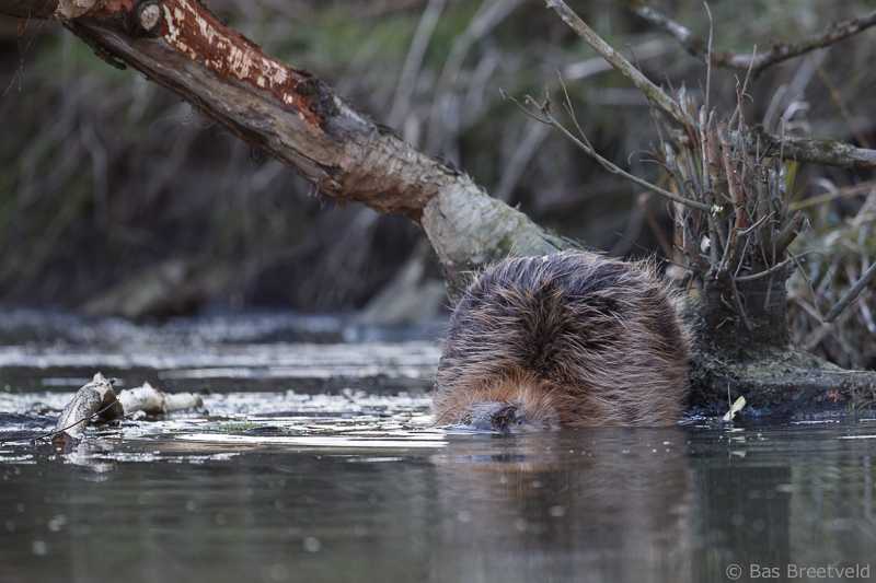 Op het moment van deze foto hadden Arend en ik twee Bevers om ons heen. Niet veel later zou deze grote (zwangere?) Bever zich verstappen en ruim een meter naar beneden donderen. Ze herstelde zich snel en keek even rond of niemand het gezien had. Let ook op de pink: precies zoals mijn schoonmoeder een kopje thee drinkt.